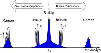 發(fā)現(xiàn)瑞利散射分量與入射光具有相同的波長(zhǎng)l 0。有兩個(gè)拉曼分量偏移相同的量(斯托克斯分量)和低于l0(反斯托克斯組件)。類(lèi)似地,布里淵背向散射由兩個(gè)在低于和高于l 0的