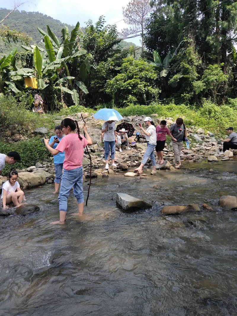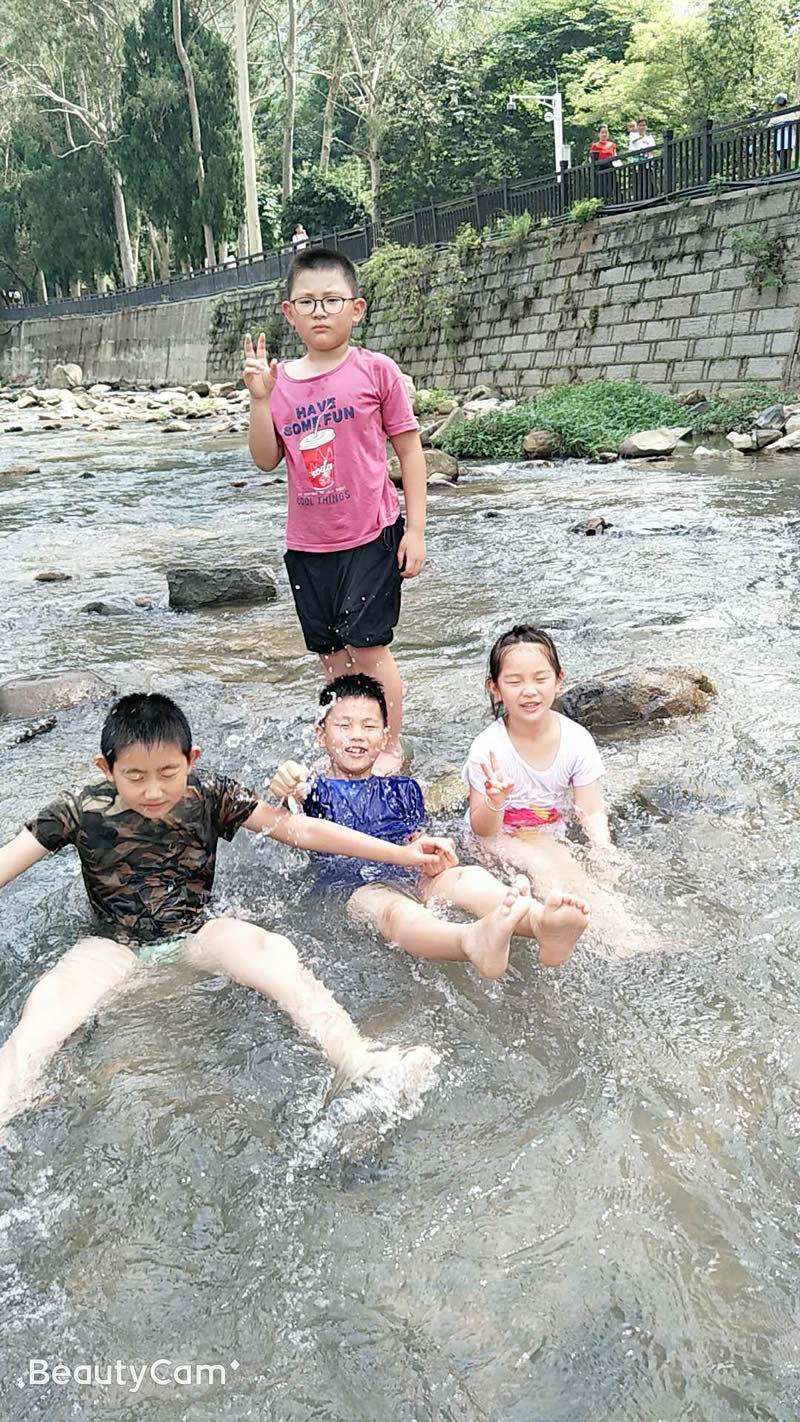 小孩們?cè)诖笕藗兊膸ьI(lǐng)下,在潺潺的溪水中歡樂的玩耍,夏季炎熱的天氣,唯有戶外的清涼能夠帶來一絲絲的暢快。